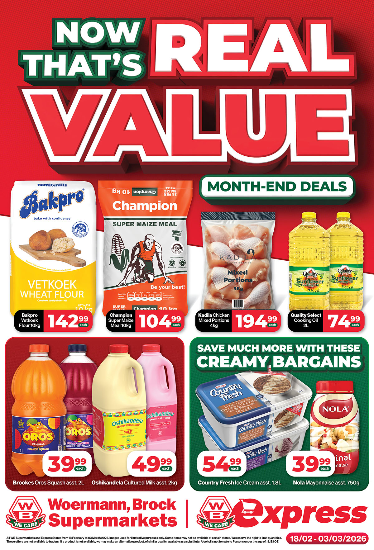 WB Supermarkets & Express Grocery Stores Specials valid 18 February – 03 March 2026 | Namibia Participating stores: Tsumeb Supermarket • Swakopmund Supermarket • Rundu Supermarket • Rehoboth Supermarket • Punyu Supermarket • Outjo Supermarket • Outapi Supermarket • Otjiwarongo Supermarket • Osona Supermarket • Oshakati Supermarket • Ongwediva Supermarket • Oneshila Supermarket • Okahandja … Continue reading WB Supermarkets Catalogues & Specials | Namibia