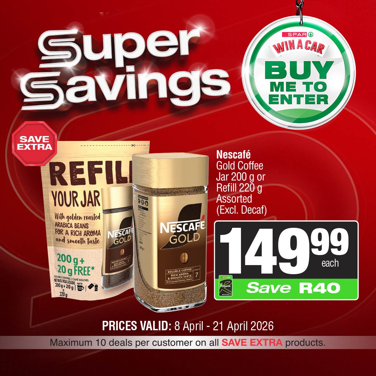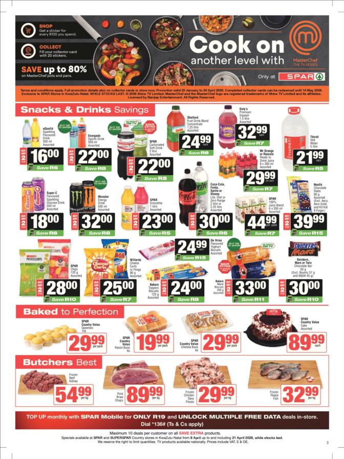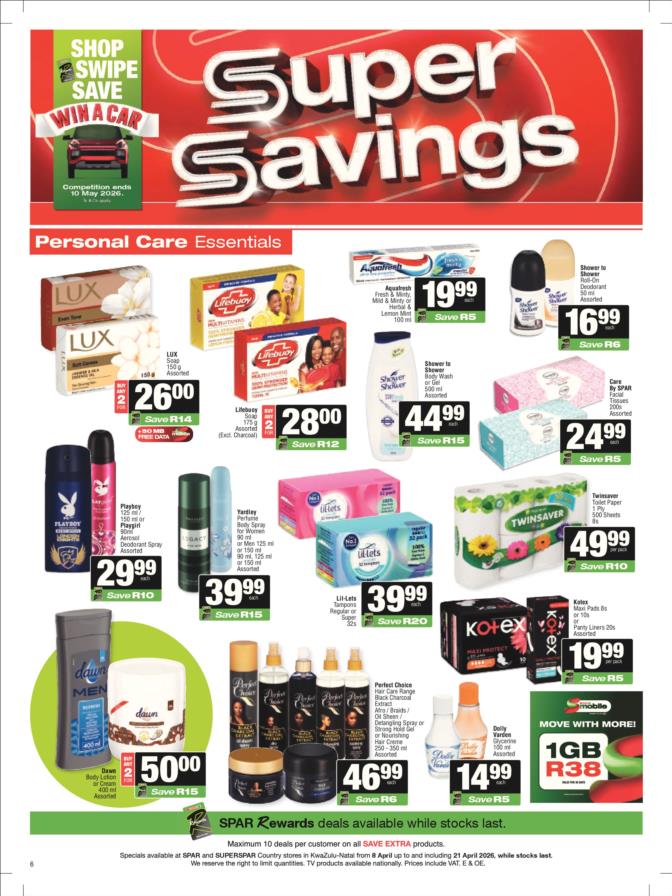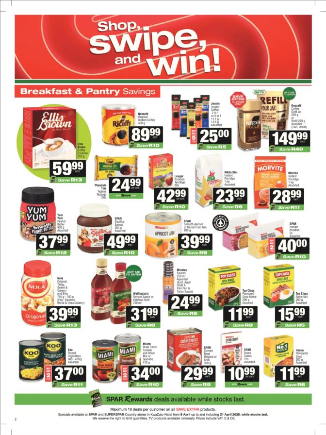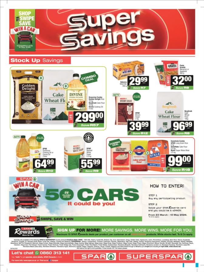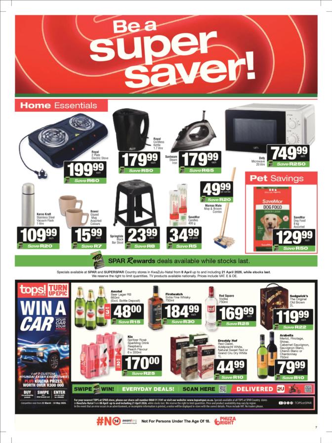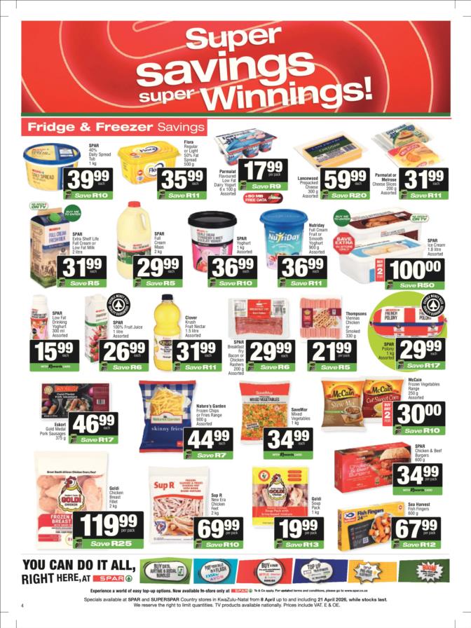 SPAR & SUPERSPAR Specials valid 08 – 21 April 2026 | (KZN) KwaZulu Natal SPAR & SUPERSPAR Deals valid 08 – 21 April 2026 | Selected stores | South Africa While stocks last. TOPS at SPAR Specials valid 08 April – 10 May 2026 | While stocks last | South Africa View all KWAZULU NATAL Catalogues & Specials View more KZN stores catalogues: Pick n Pay Pick n Pay Hypermarket Pick n Pay Liquor Food Lover’s Market Checkers Checkers Hyper Checkers LiquorShop Shoprite Shoprite LiquorShop Usave SPAR & SUPERSPAR Game Makro Makro Food Boxer Boxer Liquors Woolworths Clicks Dis-Chem OK Foods PEP Go to other Provinces: (GP) Gauteng (WC) Western Cape (EC) Eastern Cape (KZN) Kwa-Zulu Natal (FS) Free State (MP) Mpumalanga (LP) Limpopo (NW) North-West (NC) Northern Cape